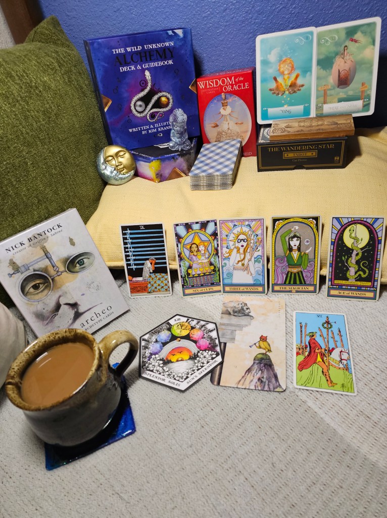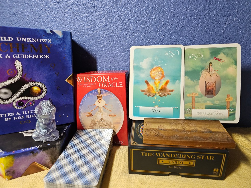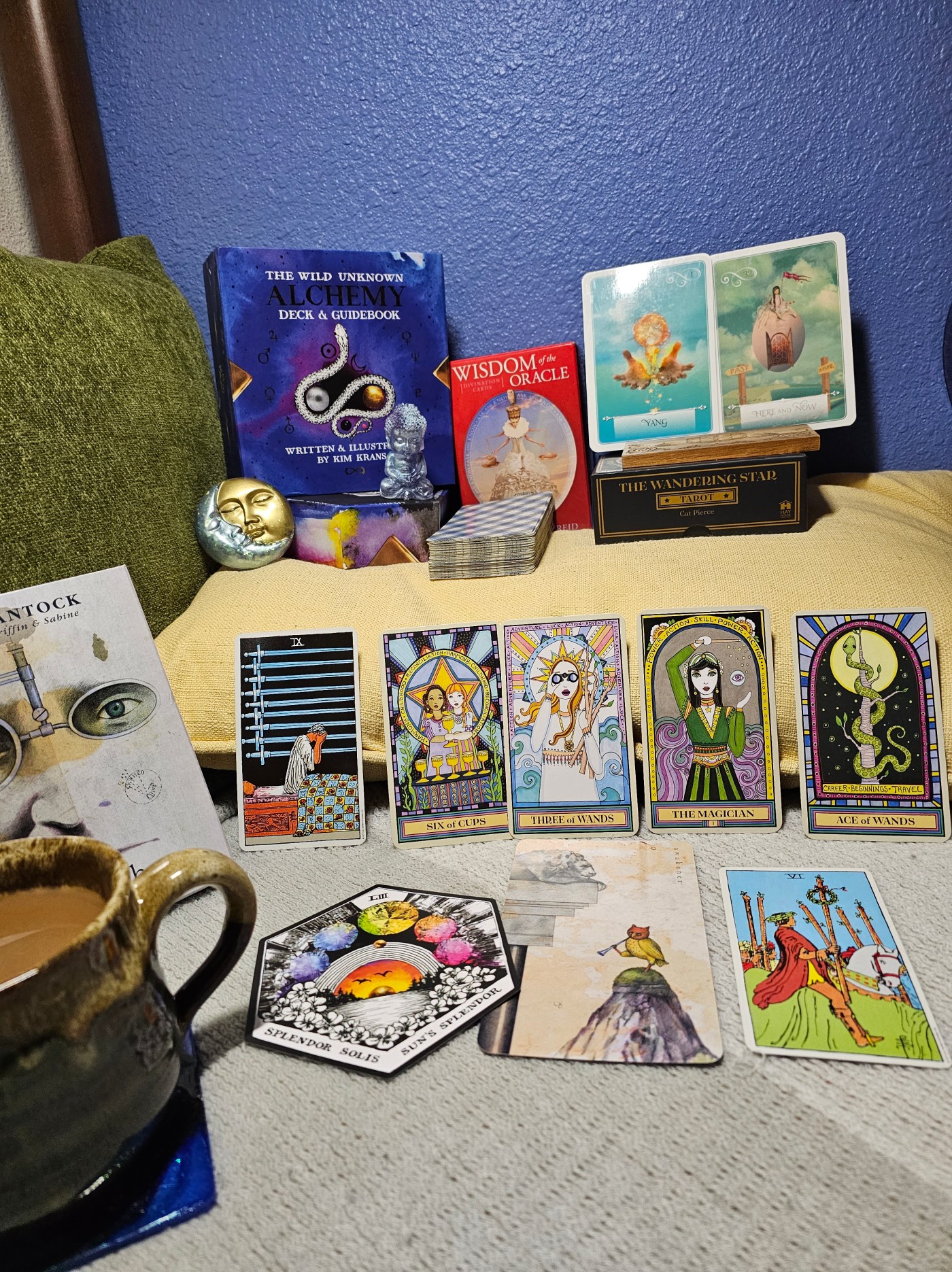 A few days ago, determined to have a blog come to fruition, I sat down in front of my altar for a fresh start and a new draw. I picked a few of my favorite decks and after meditating a bit started shuffling and seeing what cards decided to pop out and waited for a story to present itself. And as always, the cards blended together nicely, as if on purpose, and the story that lay in front of me was one about getting out of the invisible realm of thoughts and being fully alive in the present.