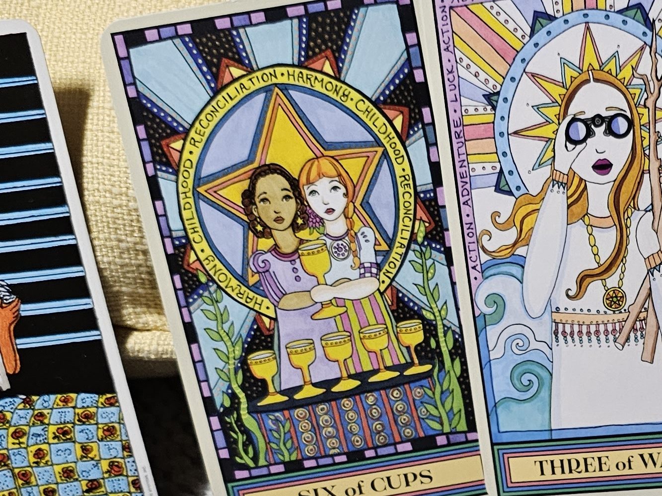 The traditional Rider Waite Six of Cups card depicts a scene that has a bit more of a childhood vibe. So if I were to take from the vibe from the traditional Rider Waite card and sprinkle it here, I’d point out how it is in childhood where we are our truest selves. If I were to relate this to Jungian Shadow work, childhood is the time before we started shoving all of the perceived unacceptable parts of ourselves into darkness. Childhood, in its best parts, is when we were so free from the what-if’s. And yeah, even when we were complete idiots. I never felt so alive as those days in childhood that I believed I could ride my bike while coasting and standing on the banana seat. In case you’re missing the visual of this…. I thought I could stand on my 1970’s bike’s banana seat, coasting forward, hands in the air, without falling off. Why would I want to do that? I can’t remember why. I was single digits and had no fear. Nope, I never achieved that feat, not even close. And yes, I wiped out many times. However, I remember the thrill of my attempts. I didn’t let the dozens of failures and scabs prevent me from believing I could achieve my goal. I don’t remember when I gave up on that dream, but I also don’t remember being crushed by the inability to achieve that dream. And that’s the spirit that I feel is the takeaway from this card: not being crushed and derailed when things don’t go as planned. Not putting off things because you’re too stuck in the mental constructions of THE PERFECTD PLAN. The spirit of this card is about being childlike in your can-do attitude and jumping all in, even if things seem likely to fail. And when they do fail, knowing that you’ll be okay, because there is always another adventure that awaits you around the corner. Maybe one that won’t involve as many scrapes and bruises! HooRAH!