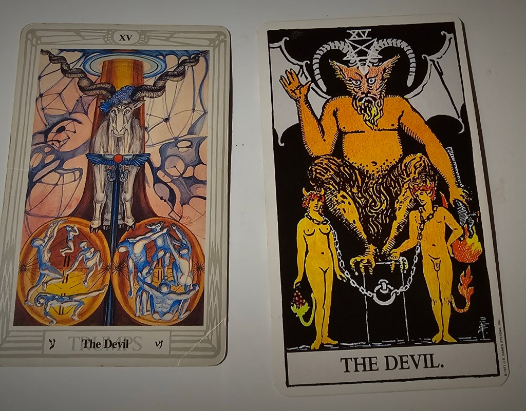 Before diving into shadowy depths, since tarot is largely about the symbolism of the cards, let’s first take a look at a couple of familiar Devil tarot cards.